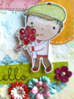 The base paper is from DCWV embossing stack .I added some distress ink to the base card.Heat emboss the blue paper with a script stamped in white and the pink paper has a white embossed wood grain image.Glue them on and add the circle DP on.Then added a emboss rectangle paper on with Tilda sitting on a pom pom trim.Add some die cut flourish, flowers,pearls and three feathers.